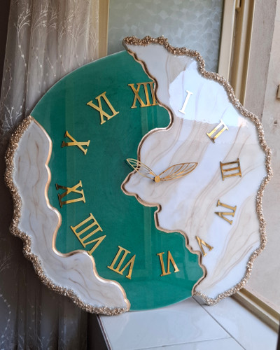 ساعت دیواری رزینی دستساز دفرمه رنگ سبز و کرم کد 456