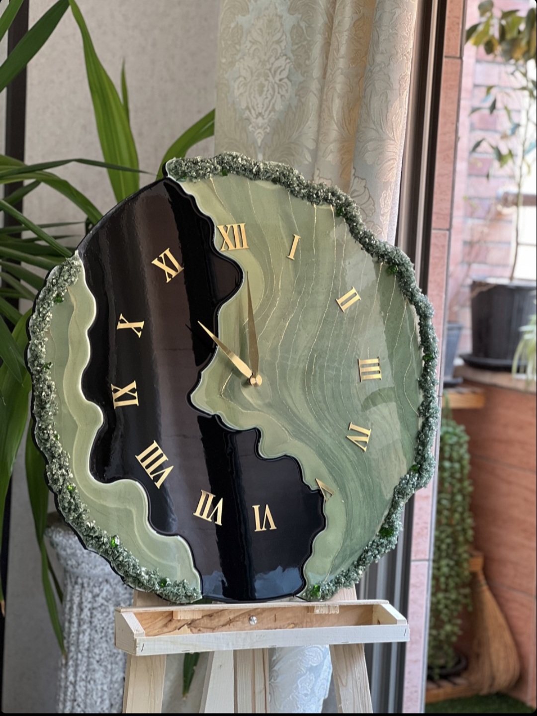 ساعت رزینی دستساز دفرمه رنگ سبز سدری و مشکی بسیار خاص و ترند